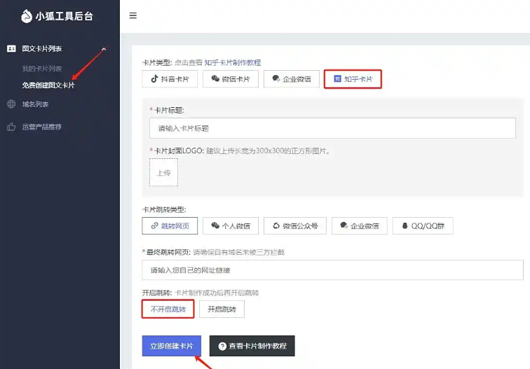 2. 选择“知乎卡片”类型,填写卡片标题、描述等信息,创建时暂不开启跳转。