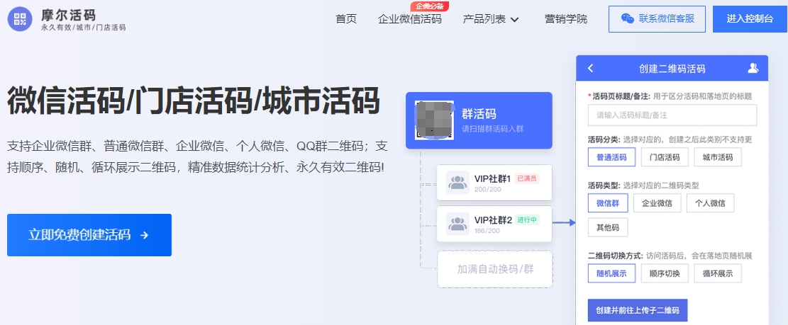 在众多二维码生成工具中,摩尔活码以其强大的功能和易用性脱颖而出,成为QQ群二维码活码创建的理想选择。摩尔活码是一款在线制作固定二维码、永久二维码以及活码的工具,特别适用于企业微信群、普通微信群、企业微信、个人微信和QQ群等场景。它的核心优势在于支持多种展示模式,包括顺序、随机和循环展示二维码,让用户可以根据实际需求灵活切换。
