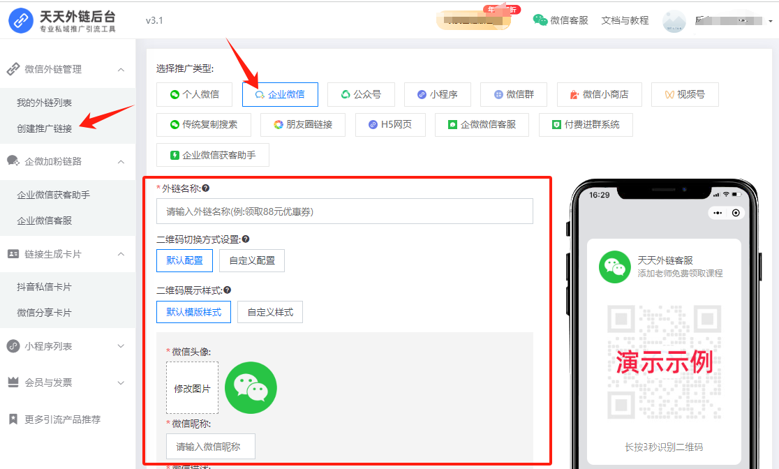 2. 创建外链任务:登录天天外链平台,在功能栏选择“企业微信”,填写任务名称,上传企业微信二维码,填写相应信息。
