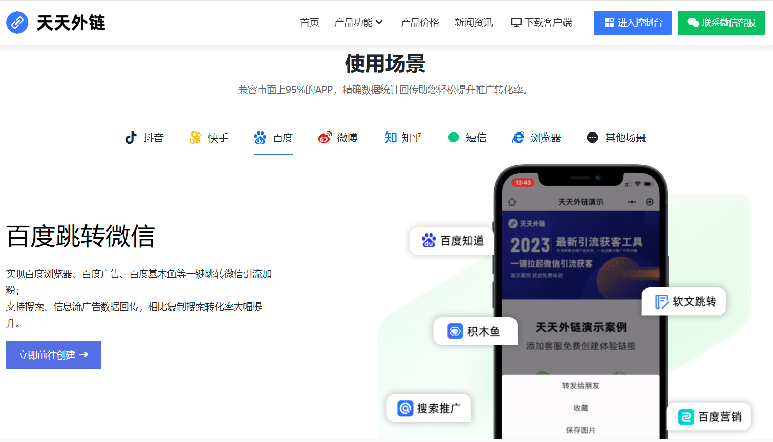 借助“天天外链”这款专业工具,用户可以轻松实现百度浏览器一键跳转微信,它不仅能生成直达个人微信、公众号、微信群或小程序的专属外链,还提供抖音图文卡片、二维码活码、广告落地页制作及数据跟踪等一站式引流功能,极大地简化了从网页到微信的跳转路径,提升跨平台运营效率。