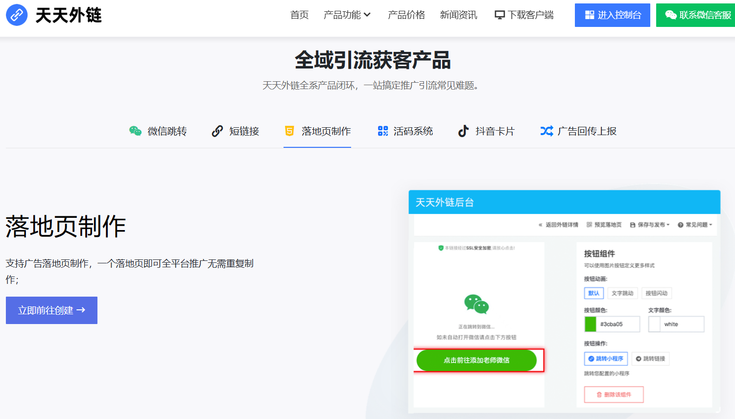 第三步是自定义优化(可选)。点击“修改落地页”可进入可视化编辑界面,自行上传引导图片、设置按钮的样式和颜色,搭配个性化文案来提升用户点击转化率。